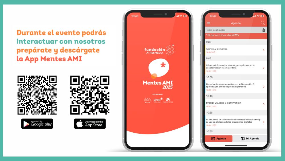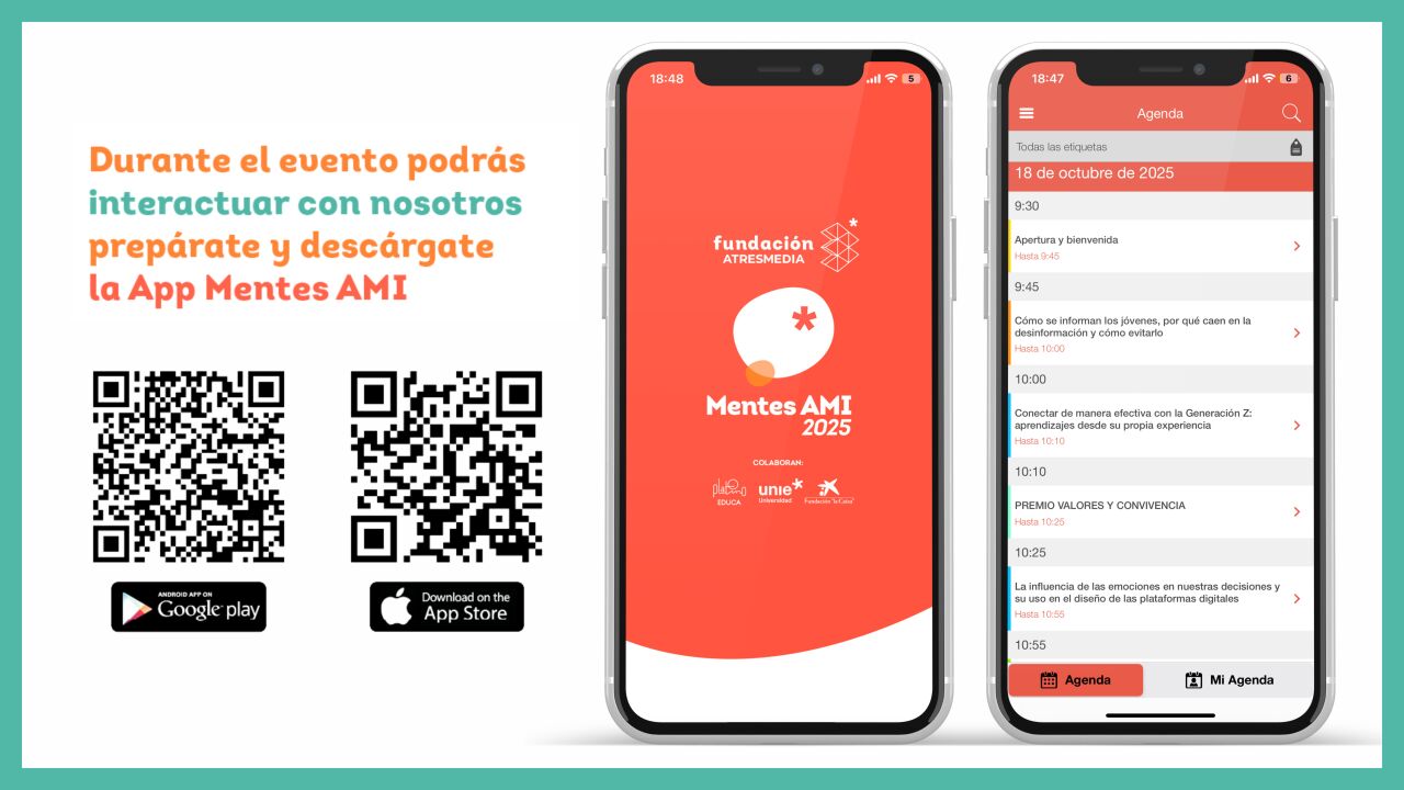 Con motivo del Encuentro Mentes AMI 2025, la Fundación Atresmedia pone a disposición de los asistentes una aplicación móvil disponible en iOS y Android a través de la cuál podrás acceder a toda la información y recursos del evento en cualquier momento y desde cualquier lugar.