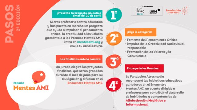 Si eres profesor o centro educativo y has puesto en marcha un proyecto que ayuda a impulsar el pensamiento crítico, la creatividad o los valores ¡preséntalo a los Premios Mentes AMI! Entra aquí y envía tu candidatura. El plazo de recepción de candidaturas finalizará el próximo 20 de abril de 2023 a las 14:00 horas.