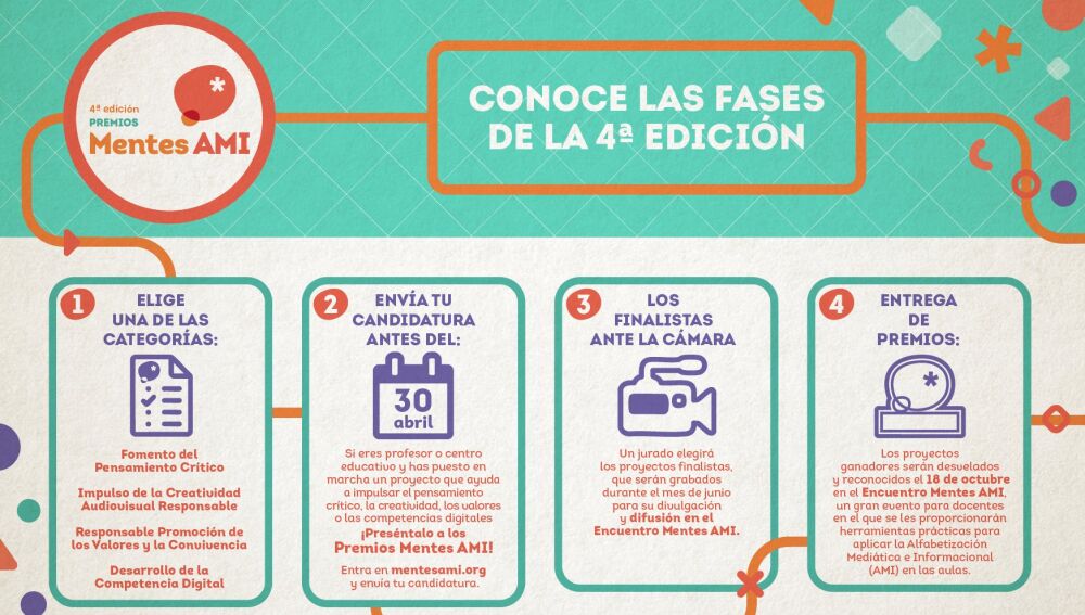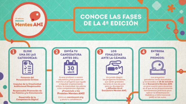 La 4ª edición de los Premios Mentes AMI se estructura en distintas fases que permiten identificar, promover y reconocer iniciativas innovadoras desarrolladas en el ámbito educativo en torno a la Alfabetización Mediática, Informacional y Digital.