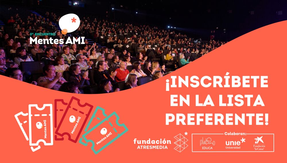 El próximo 19 de octubre, los Cines Kinépolis de Madrid acogerán el Encuentro Mentes AMI 2024, un evento organizado por la Fundación Atresmedia en colaboración con Platino Educa, UNIE Universidad y Fundación “la Caixa” dirigido a docentes de toda España. Los profesores que se inscriban en esta lista preferente tendrán la oportunidad exclusiva de conseguir la invitación una hora antes de la apertura oficial, que comenzará el 1 de octubre a las 10:00h